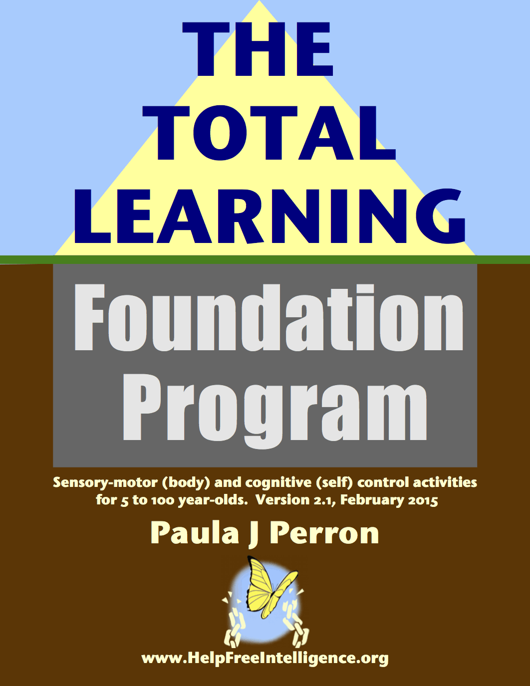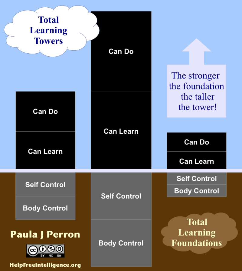 Perron, Paula J (2015). The Total Learning Foundation Program: Sensory-motor (body) and cognitive (self) control activities for 5 to 100 year-olds. Version 2.1 [PDF Book]. www.HelpFreeIntelligence.org. Copyright 2014 by the Author. CC By NC SA 3.0 — Creative Commons Attribution-NonCommercial-ShareAlike 3.0 Unported. Retrieved 5/5/2014 from http://HelpFreeIntelligence.org