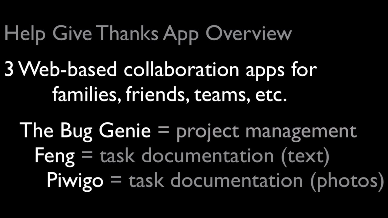 The movie above provides an overview of the hierarchy of web apps for families, teams, etc. FROM a 50-thousand-foot-view (my awesome, information-technology, manger Rita's favorite way of beginning all meetings by looking over everything generally, on my former IT team's plate), TO specific projects, their tasks, and documentation of progress on those tasks.  More movies showcasing the various apps below will be added as time permits.